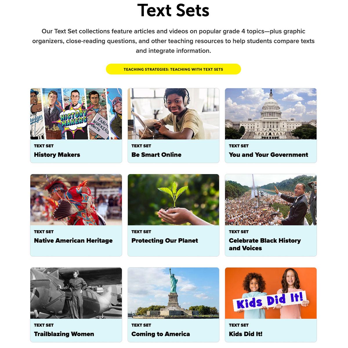 Our Text Set collections feature articles and videos on popular grade 4 topics—plus graphic organizers, close-reading questions, and other teaching resources to help students compare texts and integrate information.